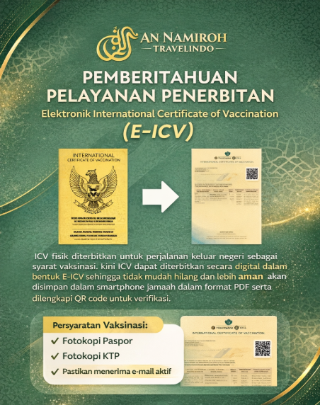 Dengan vaksin yang lengkap dan data E-ICV yang sudah terverifikasi, jamaah dapat berangkat dengan perasaan lebih tenang tanpa kekhawatiran terkait persyaratan kesehatan. Kesiapan ini memungkinkan jamaah untuk lebih fokus dalam menjalankan setiap rangkaian ibadah, sehingga perjalanan umroh dapat dijalani dengan lancar, nyaman, dan penuh kekhusyukan di Tanah Suci.
